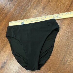Robin Piccone, black bikini bottom, high waist swimwear, women’s swim bottom, beachwear, poolside chic, flattering swim, classic swimwear, lined bikini bottom, summer staple, mid-rise bottom, stretch swim, size medium swim, beach vacation style, minimalist swimsuit, mod