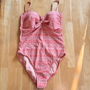 Robin Piccone Isla Bandeau One Piece Swimsuit Size 12. Peach and white with cute tie bow. The picture with the size tag gives you a true color. It’s more peach than pink. New without tags.