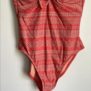 This vibrant orange one-piece swimsuit by Robin Piccone features a flattering sweetheart neckline with a charming bow detail.