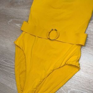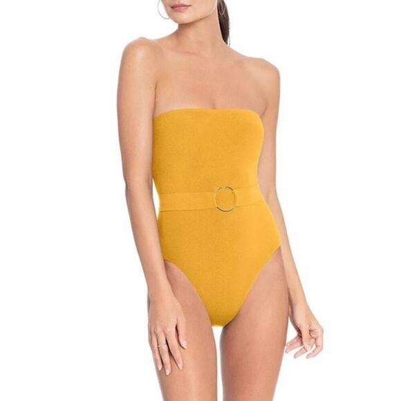Robin Piccone Luca Bandeau Strapless One Piece Swimsuit Belted Mustard Womens 10