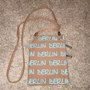Robin Ruth Berlin Canvas Crossbody Bag Brown with Berlin written in Cream and Turquoise. 2 zippered pockets with silver pulls. 7.25“ x 5.5” Strap 21” drop EUC does not appear to have been used.