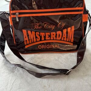 Bold brown bag with striking orange details. Features 'The City of Amsterdam' design. Ideal for daily use.