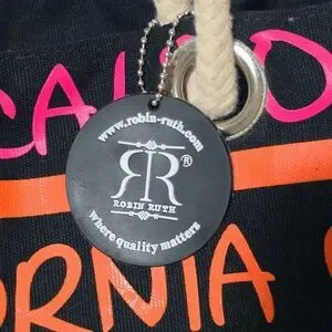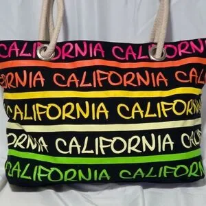Bold Robin Ruth tote with repeating "California" graphic. Black base with neon pink, orange, yellow, cream and green text stripes. Sturdy rope handles for easy carrying. Eye-catching, casual design for daily use.
