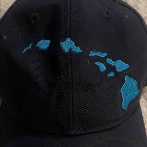 Stylish navy blue cap. Features Hawaii map design. Perfect for casual wear.