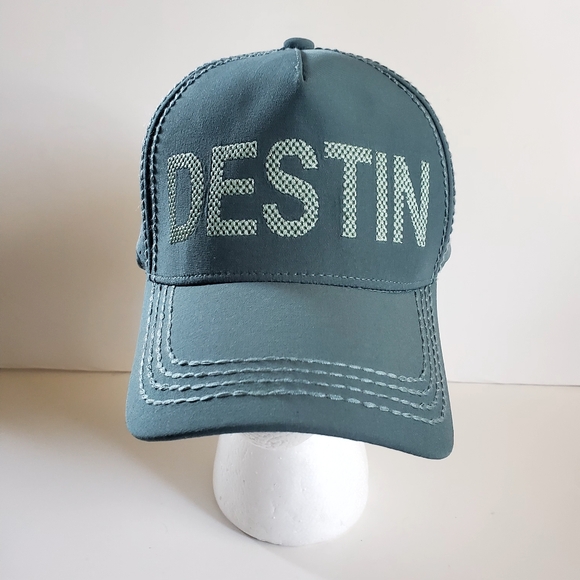 Teal cap with bold 'Destin' print. Casual and trendy design.