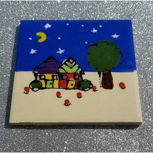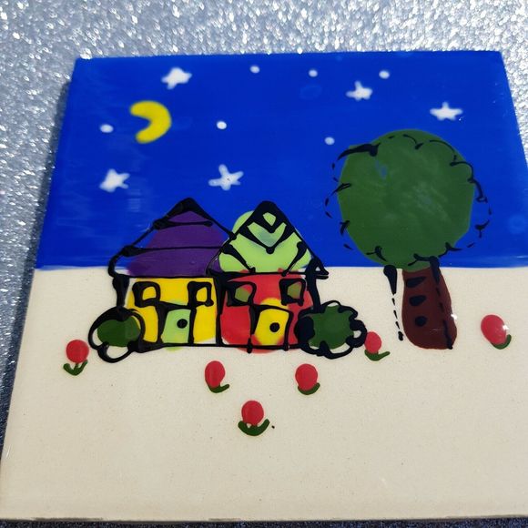 Signed one-of-a-kind Robin Sterling Art Tile Ceramic Trivet/Coaster/Plaque with Two Houses in Night Sky Moon square. Dated 2002. Handmade in the USA.