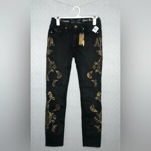 Robin’s Jean Mid Rise Women’s 27 Jeans Gold Embroidery LA Black Gothic Skinny