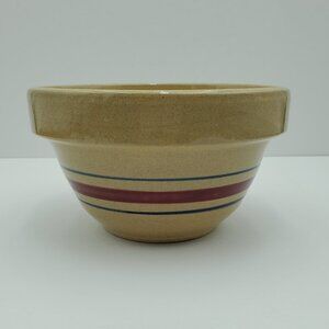 Robinson Ransbottom Pottery Company Maroon Blue Bands Mixing Bowl / R.R.P. Co. Roseville Ohio Burgundy Navy Bands Serving Bowl. This heavy, shiny bowl is in very good vintage condition with wear only on the bottom rim. 7.25" wide and 4.25" deep.