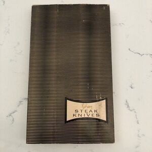 This Robinson steak knife set (6) is a vintage gem with hollow antler-style handles. The knives are made of high-quality stainless steel and come in their original box. The set includes six steak knives, all in excellent used condition.