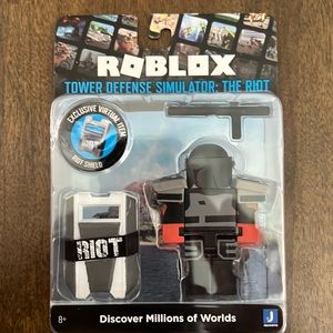Roblox Tower Defense Simulator: The Riot. The Riot with Exclusive Virtual item Riot Shield, and baton accessories. Action figure is new and still in package.