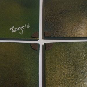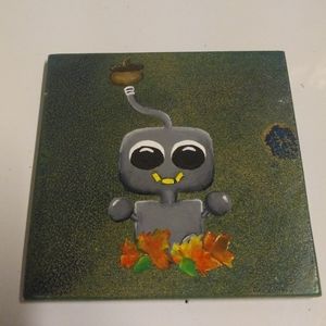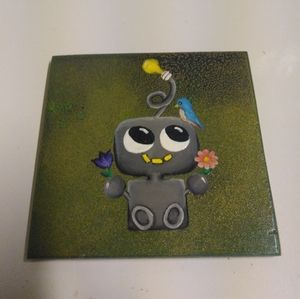 Robots representing the four seasons coasters. Hand-painted and varnished to protect the painting The bottoms have felt.