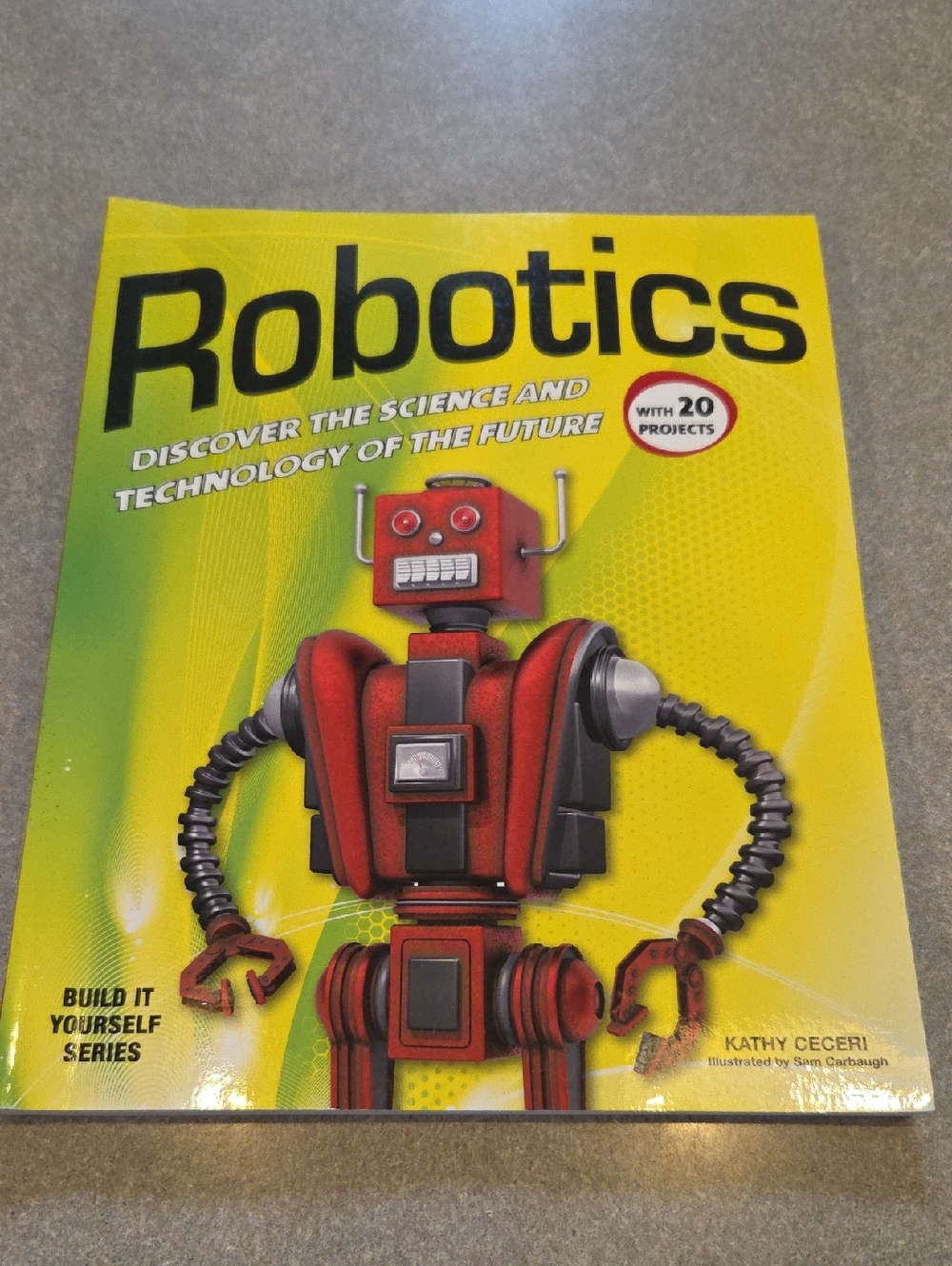 Bright yellow cover featuring a red robot illustration. Bold "Robotics" title on front. Educational tech and project-themed design.