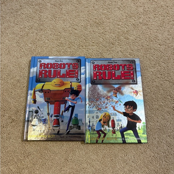 Set of two 'Robots Rule' books. Vibrant covers with red and blue tones.