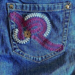 Description: Fun jeans with a stitch design on back pockets. 97% cotton/2% spandex. Medium wash.