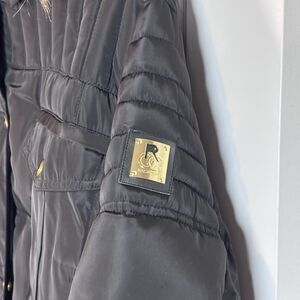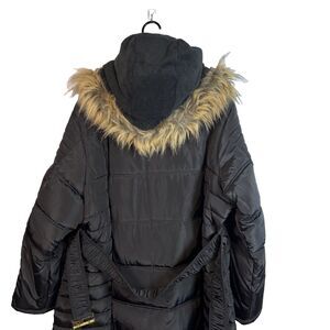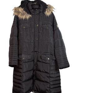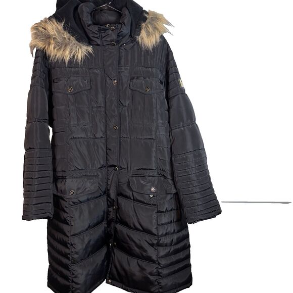 Rocawear Classic Black Long Puffer Coat women's 2X Winter Parka Faux Fur Hooded Removable Quilted Jacket.