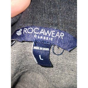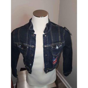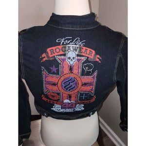Rocawear jean (denim) jacket. Absolutely perfect condition with the exception that the buttons look like an old penny. You don't notice unless looking, but it's an adorable jacket with the cross and bedazzled back. Matches everything!
