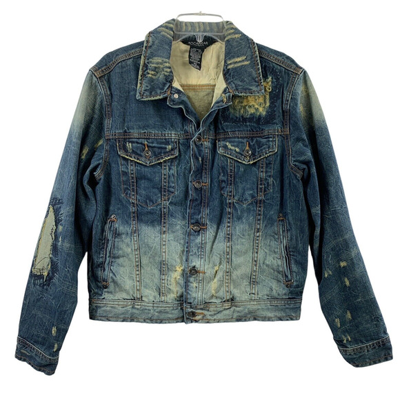 Rocawear Denim Jacket Mens Size 40 Distressed Destroyed Trucker Hip Hop Grunge