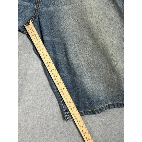 The Rocawear Men's Blue Denim Jean Shorts in size W50 are a Y2K-inspired piece perfect for a casual hip hop or skater look. Made from denim fabric with a high-rise waist and a 13-inch inseam, these shorts feature a button closure, 5-pocket design, and embroidered logo accents. The stone wash finish adds a touch of vintage style, making them a versatile option for all seasons. Machine washable and available in a big and tall size, these shorts are a comfortable and stylish choice for any man's wardrobe.