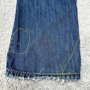 — Condition: Good. See photos 5-7for close ups on imperfections -- frayed denim on hem at bottom of pants + 2 faint discolorations