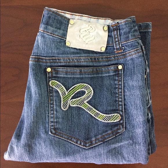 Rocawear jeans dark blue wash with lime green R logo on back pockets. Straight leg. Soft and stretchy comfortable fit. Size 7 juniors.