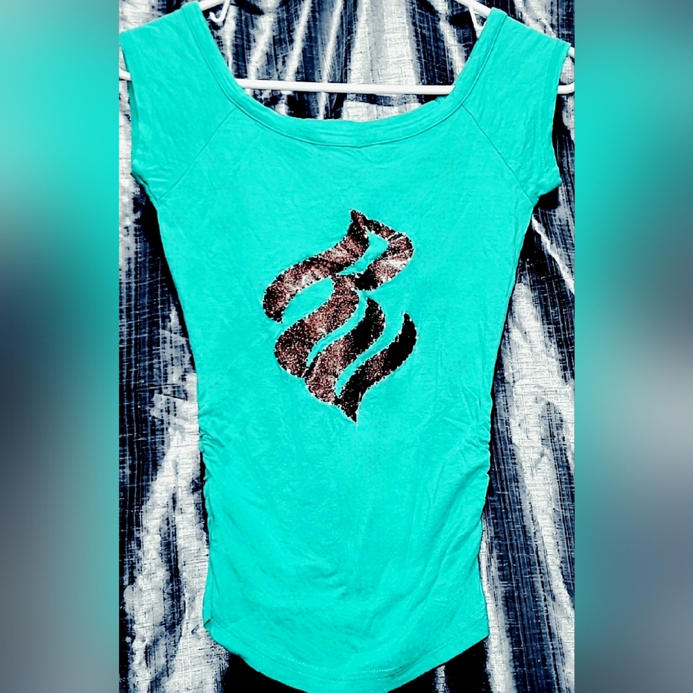 GUC Adorable Rocawear cap sleeve ruched sided bodycon top. No longer made or sold. Turquoise, glitter brown, with rhinestone shirt from Y2K Rocawear is an American clothing retailer founded in 1999 by Shawn "Jay-Z" Carter and Damon Dash, later acquired by Iconix Brand Group