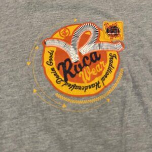 Design: Front Rocawear circular graphic in orange/yellow; small orange back-neck hit; woven Rocawear hem tag