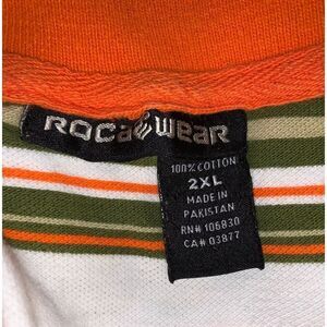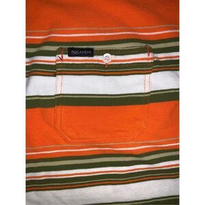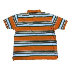 Orange multi polo shirt. Short sleeve. Two button closure. Collared. Pockets with button on chest. 100% cotton. Size: XL. Preowned in good condition.