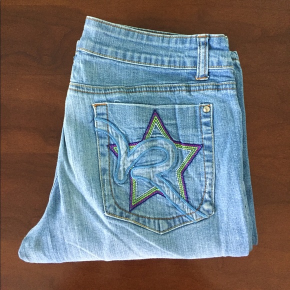 Rocawear blue jeans straight leg fit. Classic style, with purple and green stitched stars on back pockets. Size 9 juniors.