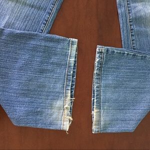 Rocawear jeans with brown and white stitching on back pockets. Slightly flared leg. Size 11 juniors. Some fraying around gems, as seen in photos.