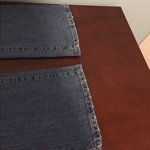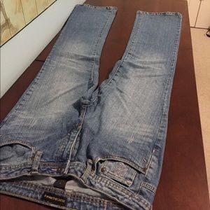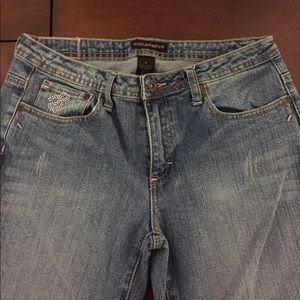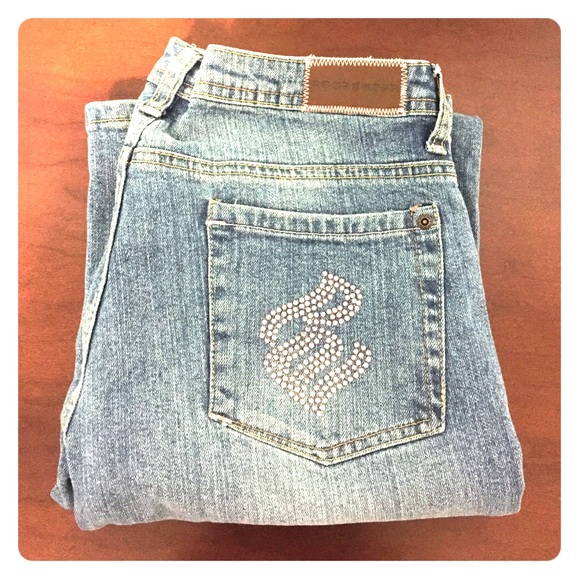 Rocawear blue jeans. Slightly flared leg. Size 9 juniors. Pink rhinestone Logo on right back pocket.