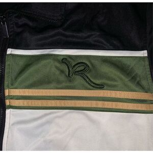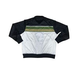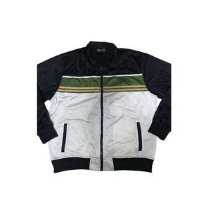Black, white, olive green and tan track jacket. Side pockets. Full zip closure. 100% polyester. Size: 2XL. Preowned in good condition.