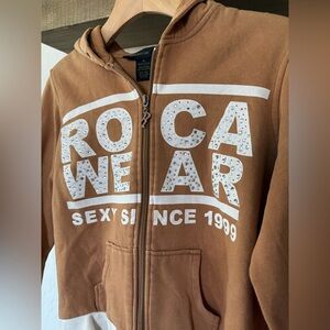 Trendy Rocawear hoodie featuring bold white lettering. Includes front pockets and zip closure.