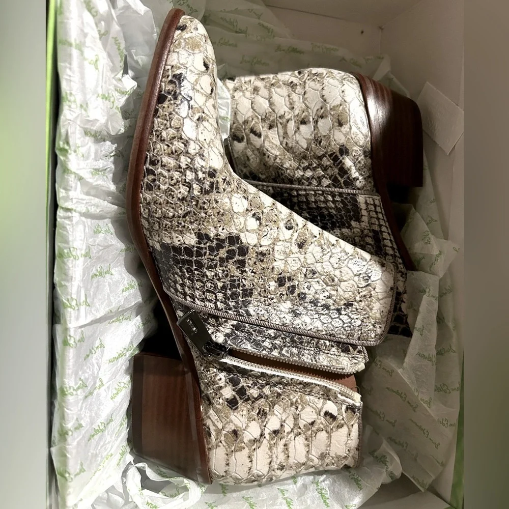 Modern textured leather booties with an allover snakeskin print. Roccia Python