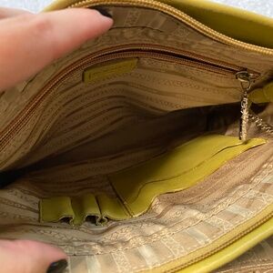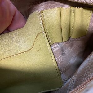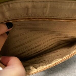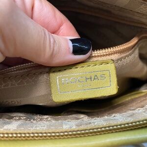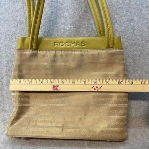 Rochas Paris Two Handle Purse Fabric & Leather 10" Tan / Green Phone Pouch