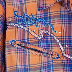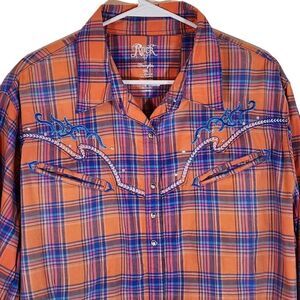 Rock 47 By Wrangler Women's Orange Blue Plaid Embroidered Embellished Button Up Shirt Size 3XL