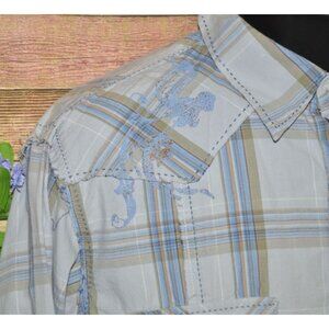 This Rock 47 Western shirt features a stylish gray plaid design with pearl snap buttons and raw hem embroidery, perfect for cowboy or rodeo attire. Crafted from comfortable cotton, it's an ideal choice for any Western-themed occasion.