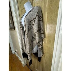 This is a women's Rock 47 cardigan kimono cape oversized in size S with a Western Aztec print design. It features kimono short sleeves and fringe accents, made of polyester and spandex material. The cardigan has an open front style and a relaxed fit. Perfect for adding a touch of Western style to your outfit.