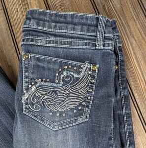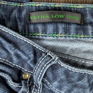 Ultra low rise size 7 with 34" inseam. Hem turns up at end. From a smoke free home.