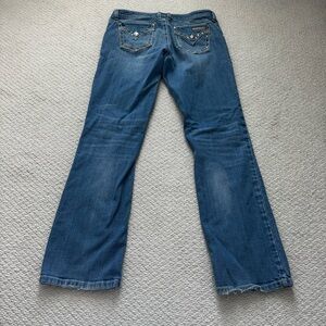 Rock 47 by Wrangler ultra low rise preloved boot leg jeans, has some bleach spots on one leg, please look at all photos