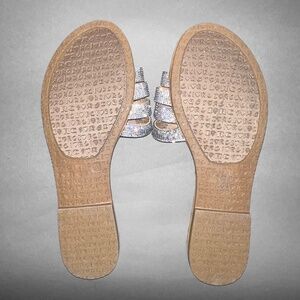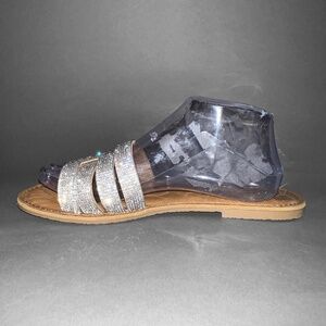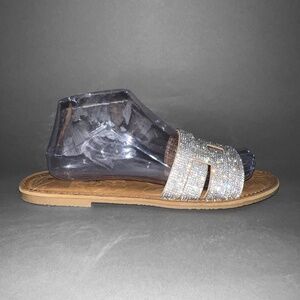 - Flat slides with woven top encrusted with tiny clear rhinestones
