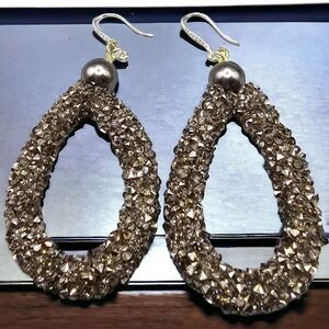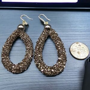 Rock Glittered Teardrop Earrings Pierced Dangle Artisan Style Sparkly Gray Color