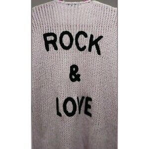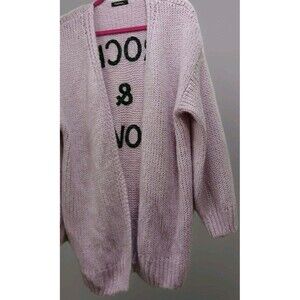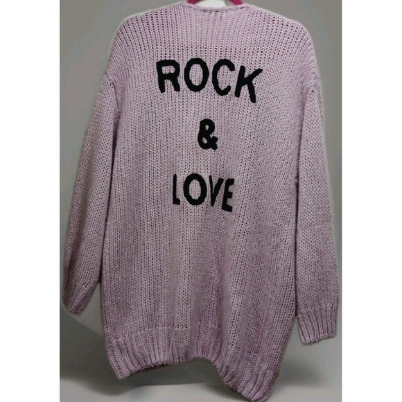 Super cute and cozy open front cardigan in a soft light pink/lavender blend womens medium with stretch. Large bold ROCK & LOVE felt lettering across the back gives it major Grease meets boho vibes.