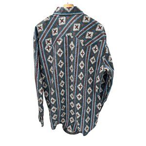 Blue Aztec Pattern By Rock N Roll Denim Sz XL, Pearl Button, Blue, red, Cream in Great Condition. Purchased from thrift (AS IS CONDITION) Light box used to give you the best views of items condition, NO RETURNS. Wash before Wearing.