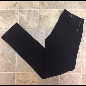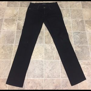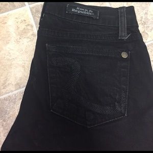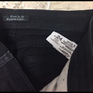 Gently used Rock & Republic Berlin jeans in Tijuana color (skinny jeans in black). These are a sample pair, which is why the tag looks weird, but they are 100% authentic. Tag marked as size 24...I would say 24-25 petite. Inseam 28".