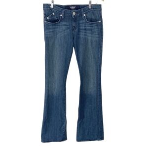 This is a pair of Rock & Republic Blue denim bootcut jeans. Medium wash. Cotton blend. Light distressing. Zip front closure with button. Embroidery detail on back pockets. Machine washable. Women’s size 28. Waist 15”. Rise 8”. Inseam 33”. Excellent gently used condition.