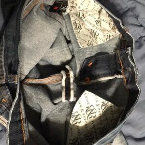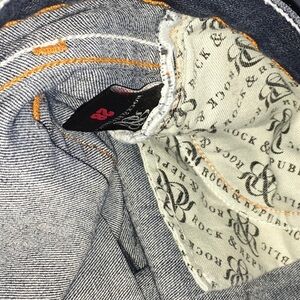 Rock & Republic sz 28 summer or vaca fun denim euc stitched cuff no material tag R on pocket unique 28 would equal about a size 6 fun summer cheap R&R distressed a bit 8-1/4” front rise 13-1/4” back rise 7-1/2” bottom 14” inseam color is a bit on the darker blue side