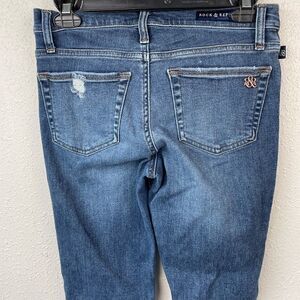 Classic pair of distressed skinny jeans by Rock & Republic in excellent preowned condition. They measure 15 inches at the stretch fit waist and have a 27 inch inseam.
