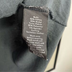 Size small. Scoop neck. Black faux leather trim at the neck and shoulders. Cream colored scroll print. Short sleeves. High low rounded hem.