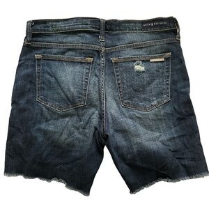 Blue denim shorts distressed styling with fading and whiskering and a raw hem