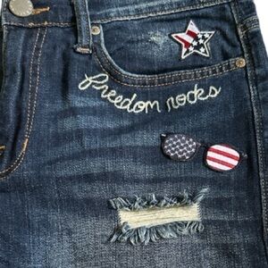 Rock & Republic "Freedom Rocks" Shorts Raw Hem Red White & Blue Patches Distressed